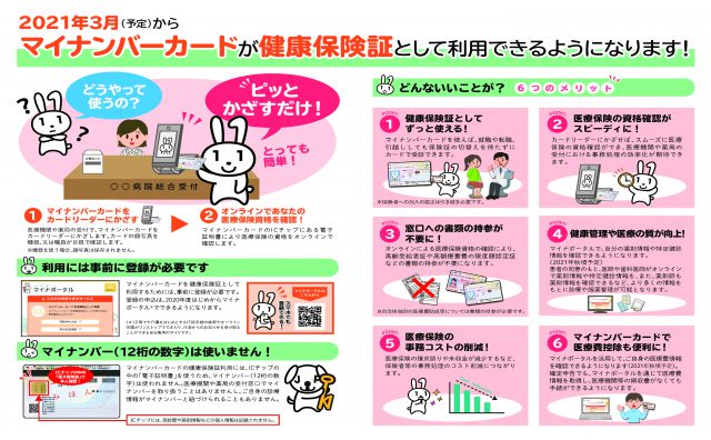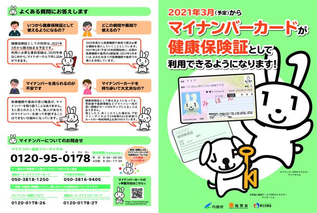 内閣府・総務省が作成したリーフレット「2021年3月(予定)からマイナンバーカードが健康保険証として利用できるようになります」で紹介されていますので、お知らせします。